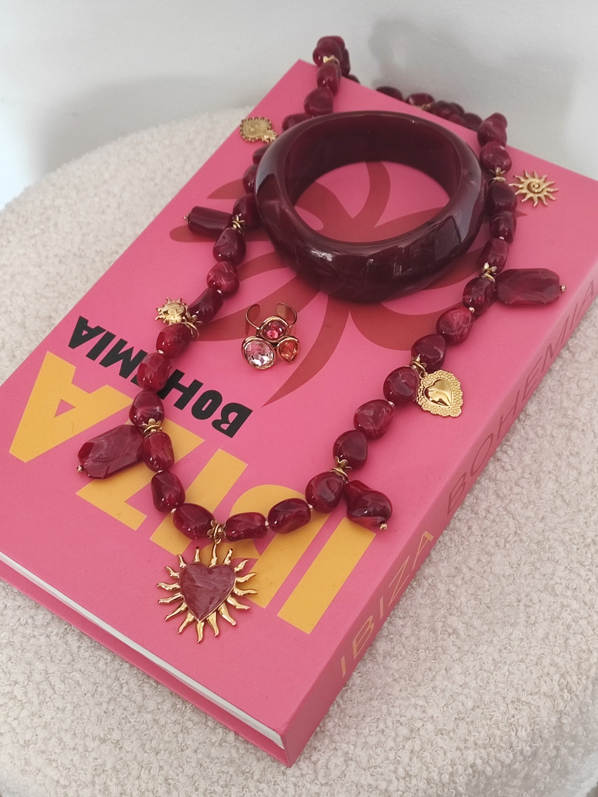 Sautoir dans les tons bordeaux avec charms