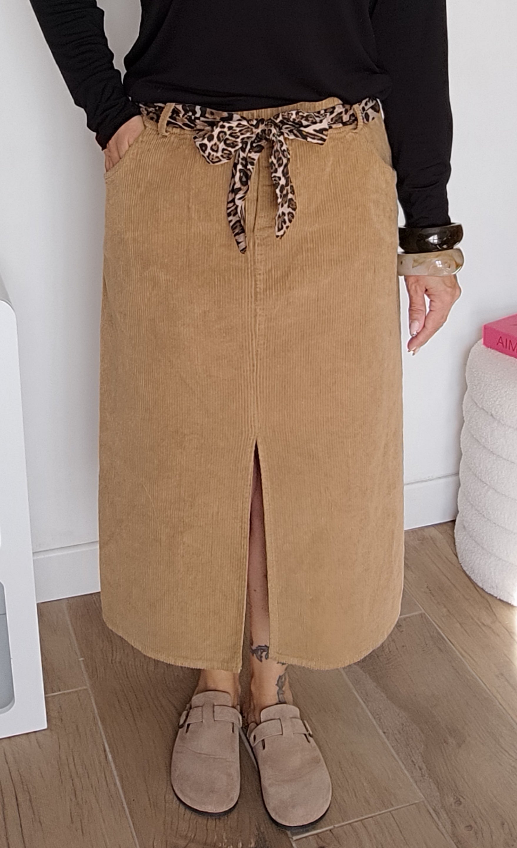 Jupe en velours côtelé Camel avec ceinture tissu Léopard