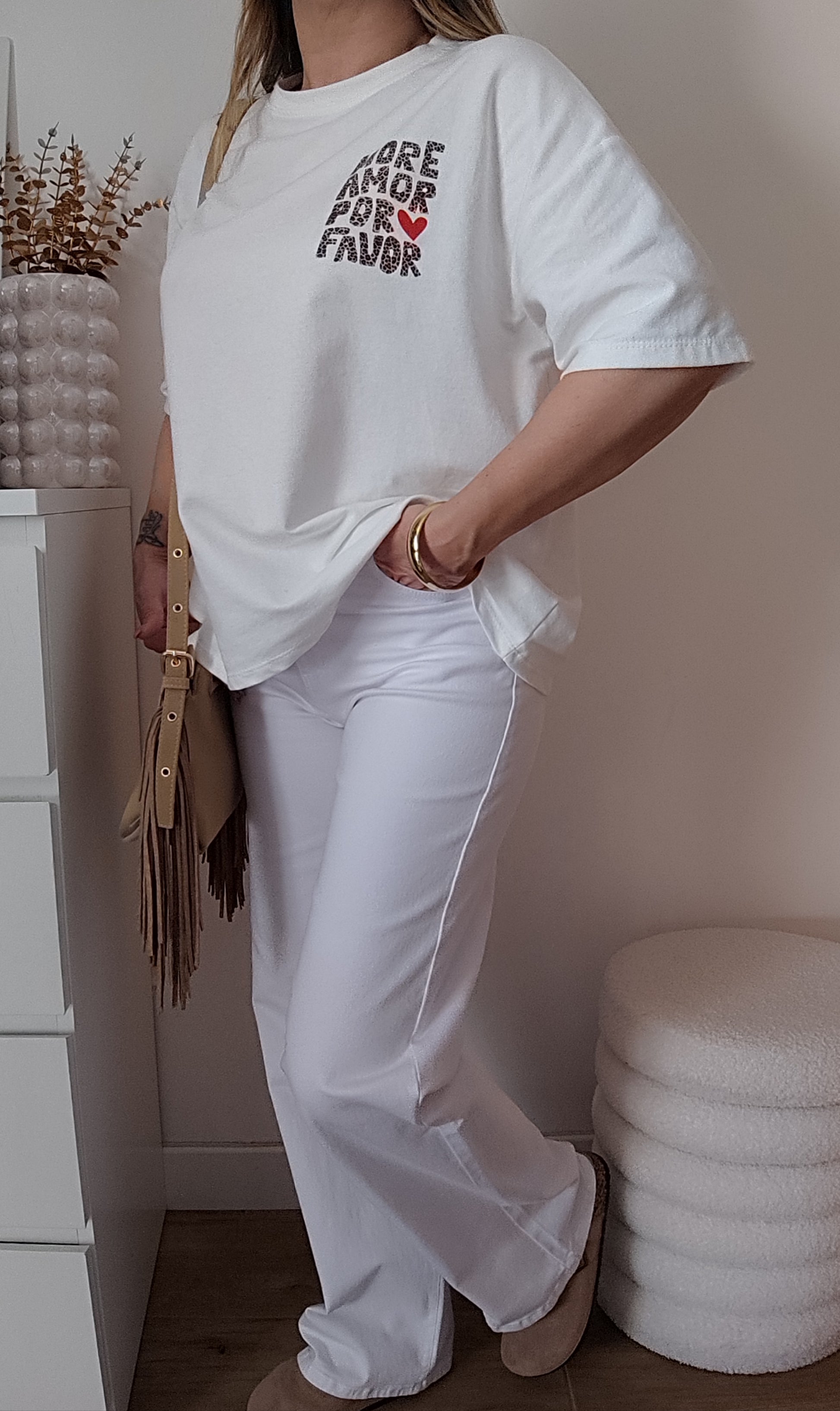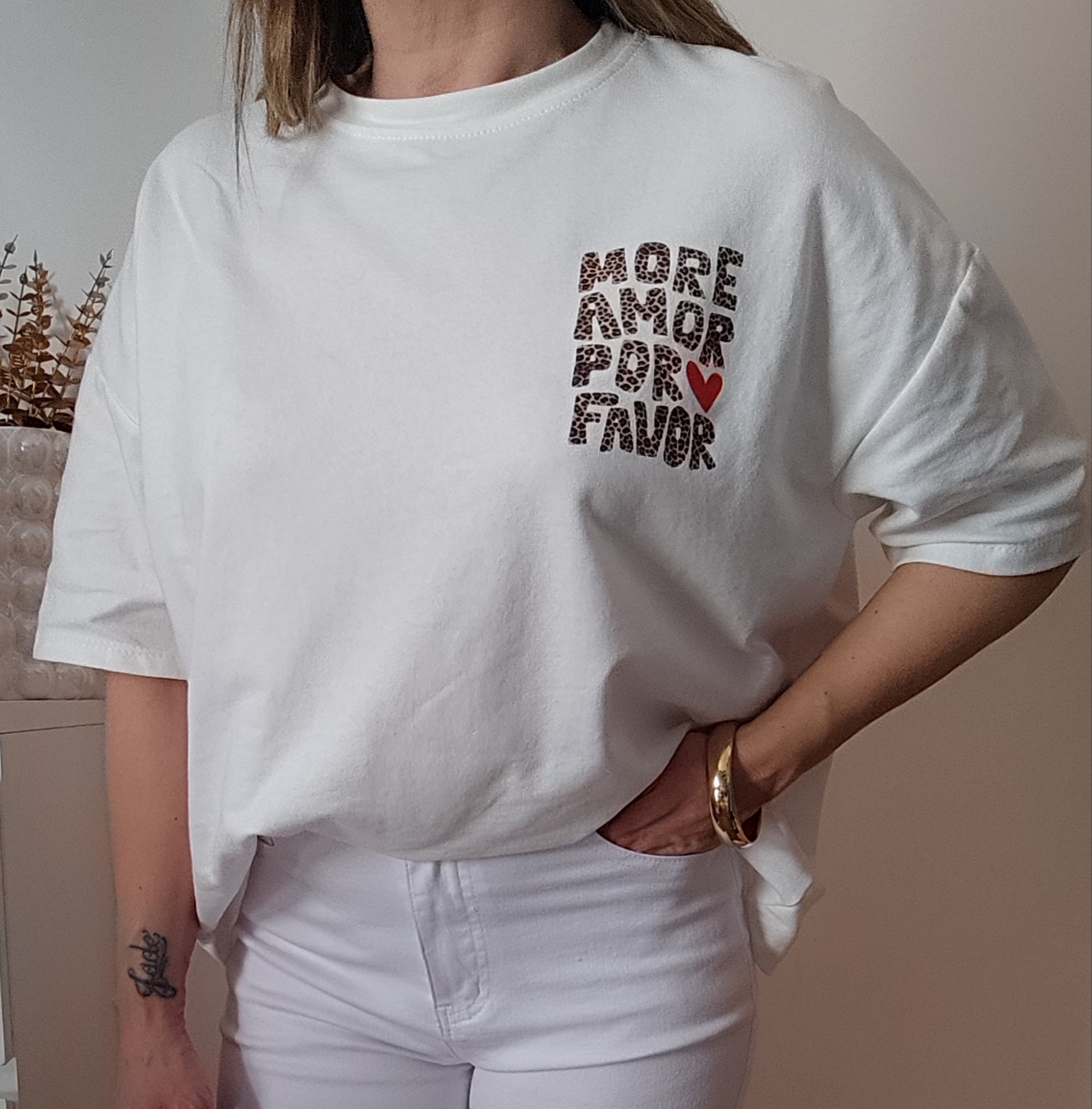 Tee-shirt avec inscription "More Amor por Favor" en petit devant et en grand dans le dos